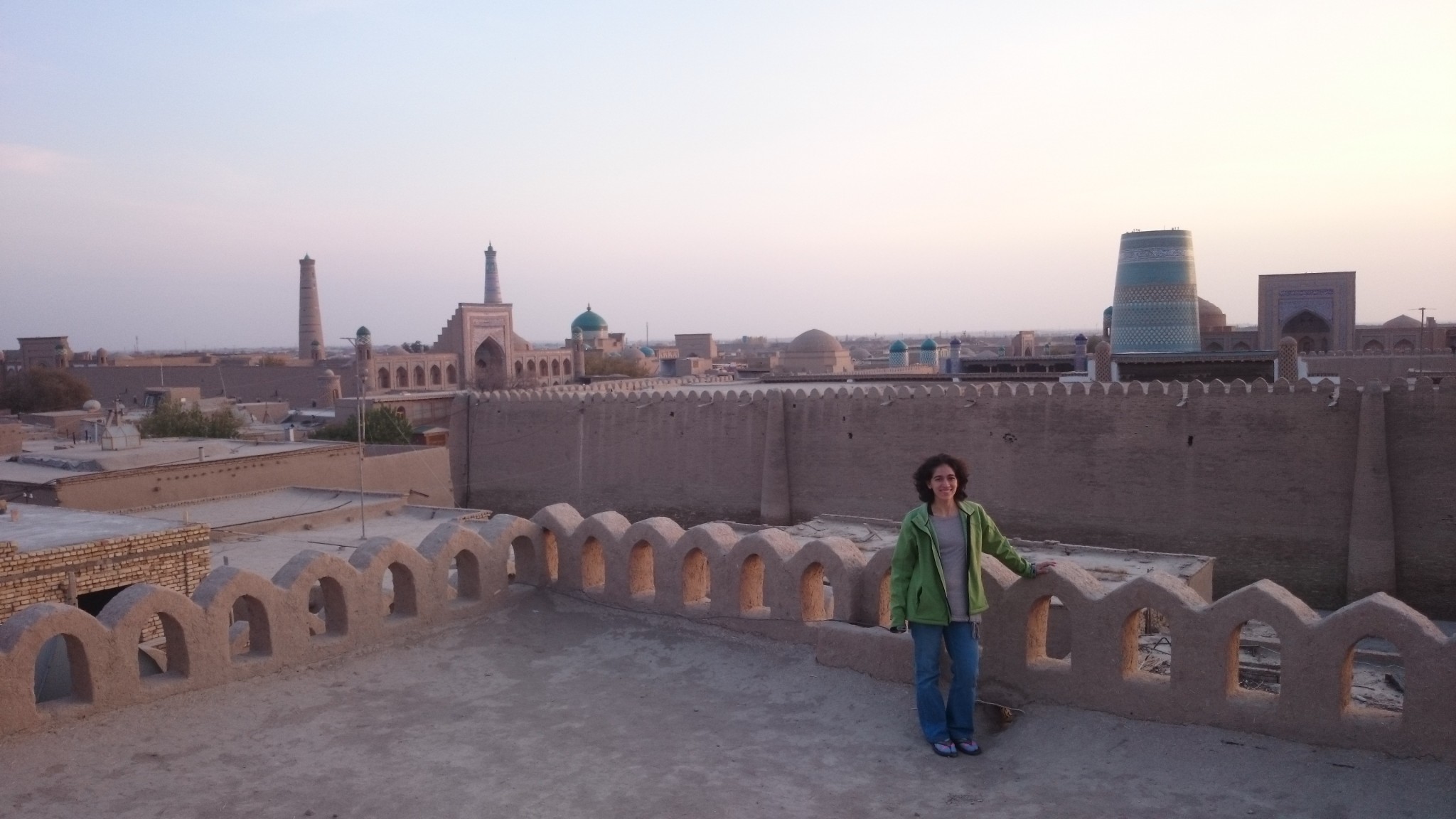 Nuestra primera parada es Khiva, antes la capital de comercio de esclavos en la Ruta de la Seda en el Oeste de Uzbekistán. Es bonito, increíblemente bonito. Las murallas de ladrillo y luda alrededor de la ciudad siguen intactas y circunscriben madrazas, mezquitas, y alminares. Llegamos tarde en el día (Almaty a Tashkent a Khiva), pero podemos tomar unas fotos al atardecer (vean foto de arriba). Miren, Khiva.
