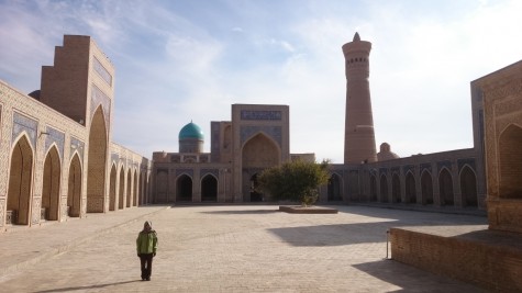 Nuestro lugar favorito de Bujara hasta ahorita, es una plaza que tiene una madraza grande por un lado, y una mezquita al otro lado, y tiene una alminar en el medio. El alminar tiene 14 anillos alrededor de su y cada uno es de diseños diferentes. Pueden ver de lo que estoy hablando en la foto e abajo. La cámara de Cindy permite tomar fotos más amplias y actualmente capturo todo el alminar, pero fui muy flojo como para transferir sus fotos.